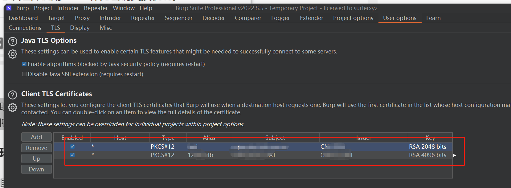 通过分析发现APP在请求的时候也确实加载了客户端证书,因此尝试提取客户端证书和密钥后,导入抓包工具BurpSuite,还是失败...........
