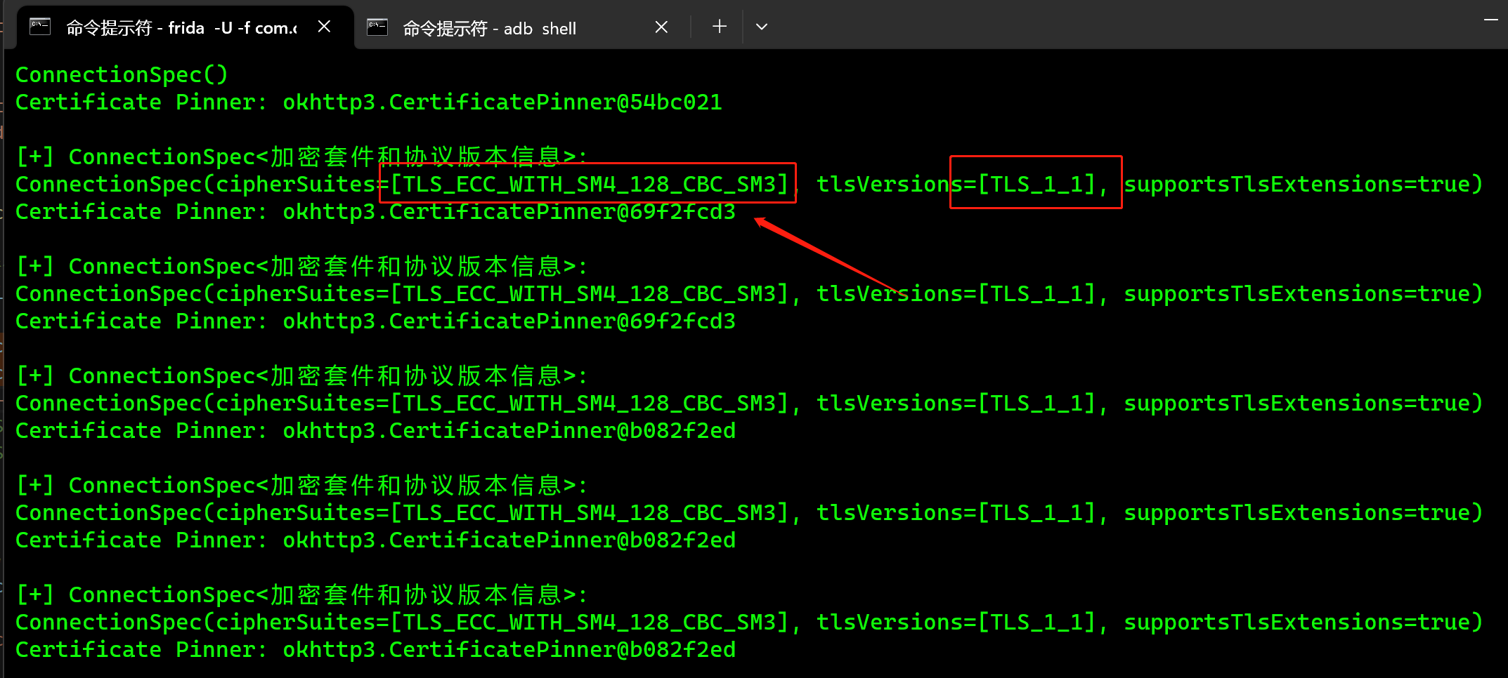 console.log("\n[+] ConnectionSpec<加密套件和协议版本信息>: \n" + spec);